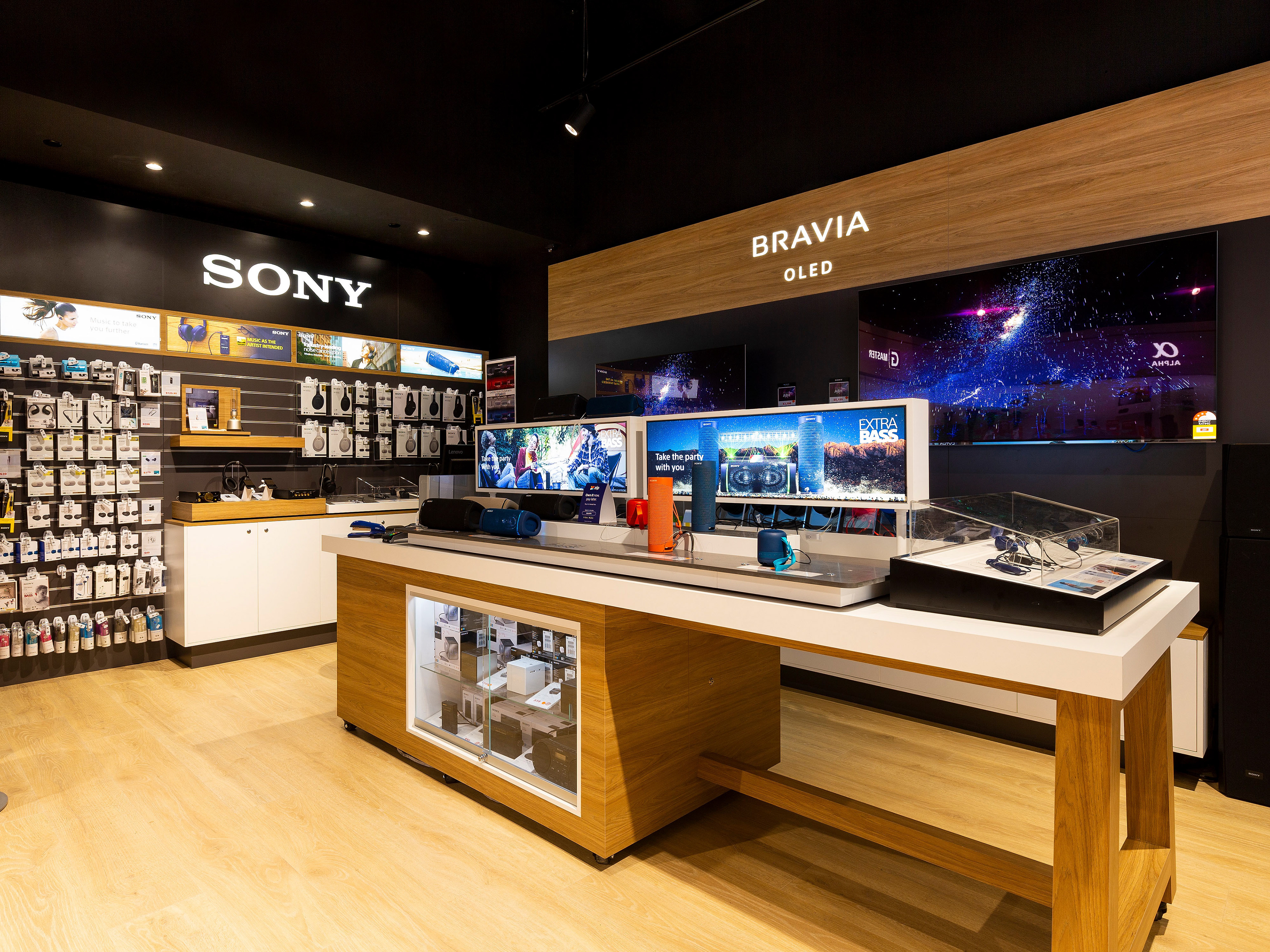 The trans-Tasman installation presented immense logistical challenges, given the travel restrictions that were present during most of 2020. With a brief from Sony to create their flagship store within the Sylvia Park Shopping Centre in Auckland, Infocus Design delivered a sophisticated design which guaranteed brand consistency and enhanced customer engagement by reflecting the appearance of Sony’s Australian stores. Efficient logistics and project management were crucial in order to meet the store fitout’s tight deadline. All joinery was built in-house and shipped in two 40 foot containers from Infocus Design’s Lane Cove premises. Upon arrival the installation was completed by our trusted New Zealand partner.
